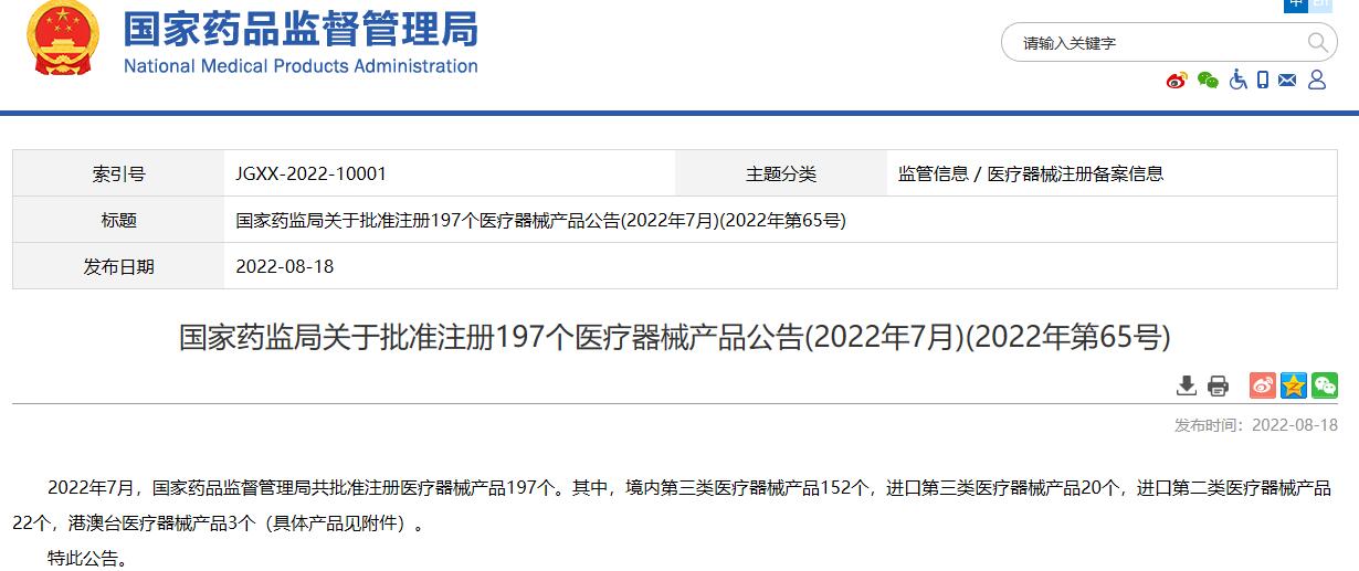 國家藥監(jiān)局關(guān)于批準(zhǔn)注冊197個醫(yī)療器械產(chǎn)品公告(2022年7月)(2022年第65號)