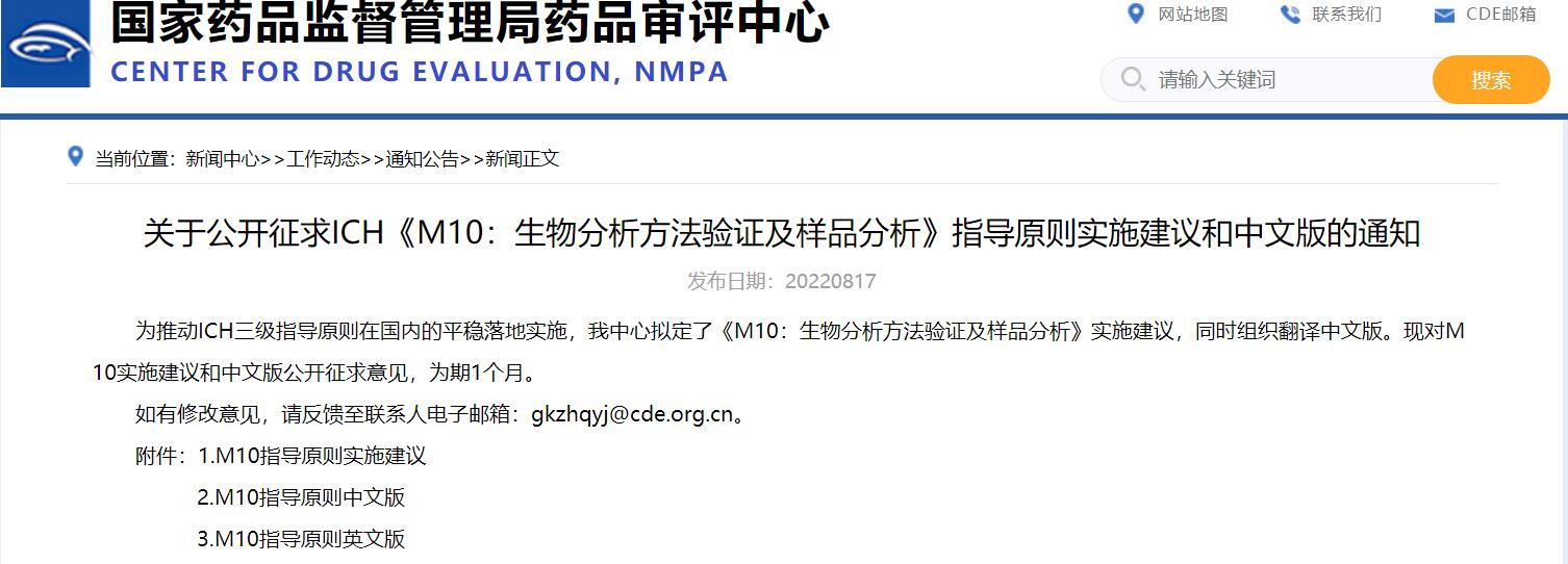 關(guān)于公開征求ICH《M10:生物分析方法驗(yàn)證及樣品分析》指導(dǎo)原則實(shí)施建議和中文版的通知