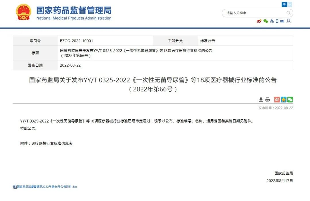國(guó)家藥監(jiān)局關(guān)于發(fā)布YY/T 0325-2022《一次性無(wú)菌導(dǎo)尿管》等18項(xiàng)醫(yī)療器械行業(yè)標(biāo)準(zhǔn)的公告