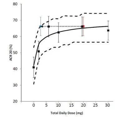 本品種PD研究中以美國風濕病學會(ACR)規(guī)定觀指標,若患者達到20%、50%或70%的緩解,即達到ACR20、ACR50或ACR70緩解。