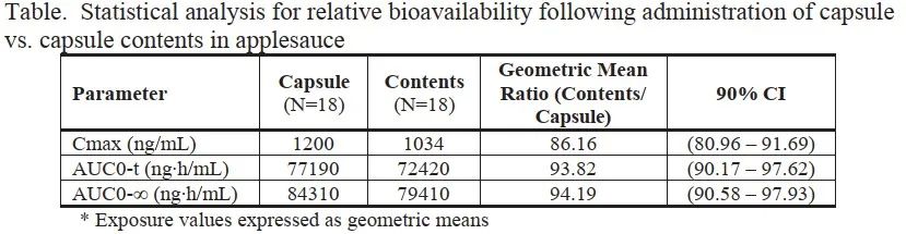 數(shù)據(jù)表明兩種服藥方式生物等效,表明該膠囊服用時可去掉囊殼,膠囊內(nèi)容物與軟性食物一同服用。