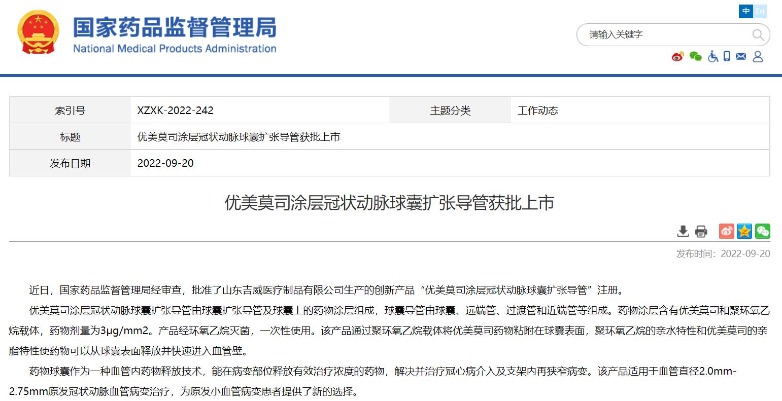優(yōu)美莫司涂層冠狀動(dòng)脈球囊擴(kuò)張導(dǎo)管獲批上市
