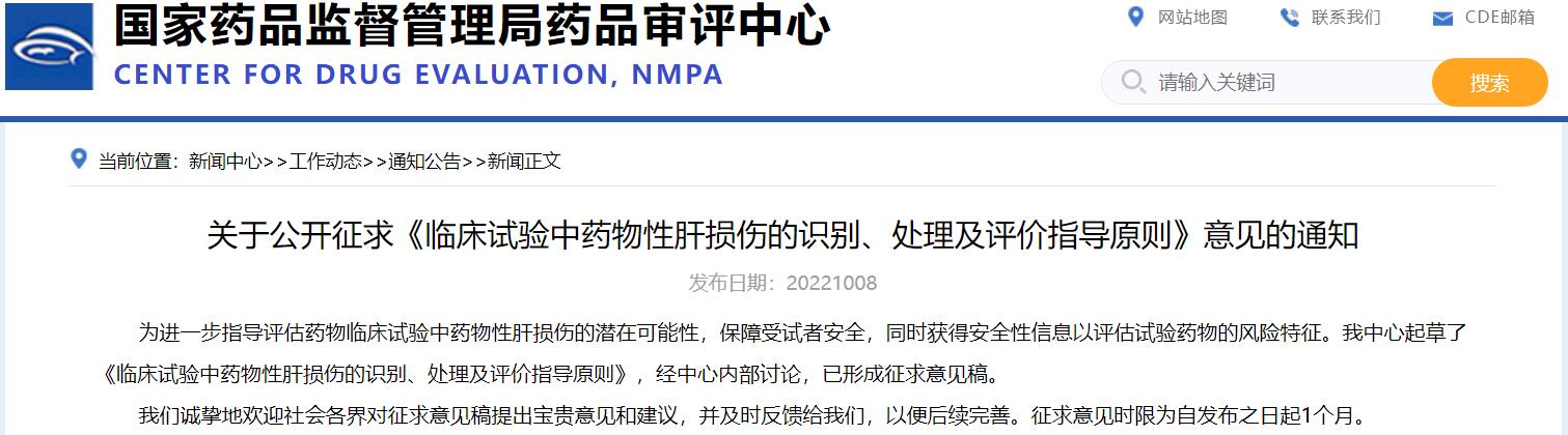 關(guān)于公開征求《臨床試驗(yàn)中藥物性肝損傷的識(shí)別、處理及評(píng)價(jià)指導(dǎo)原則》意見的通知