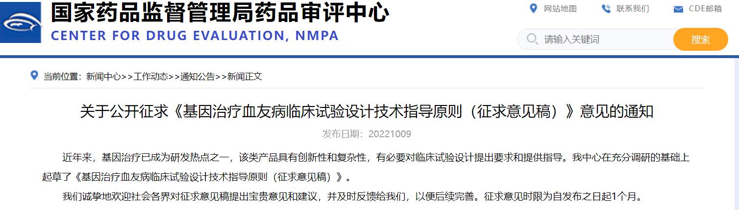 關(guān)于公開征求《基因治療血友病臨床試驗(yàn)設(shè)計(jì)技術(shù)指導(dǎo)原則(征求意見稿)》意見的通知