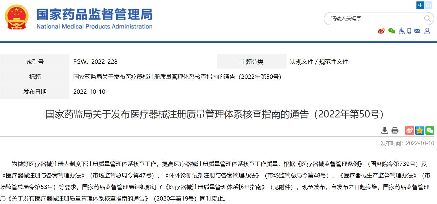 國(guó)家藥監(jiān)局關(guān)于發(fā)布醫(yī)療器械注冊(cè)質(zhì)量管理體系核查指南的通告(2022年第50號(hào))