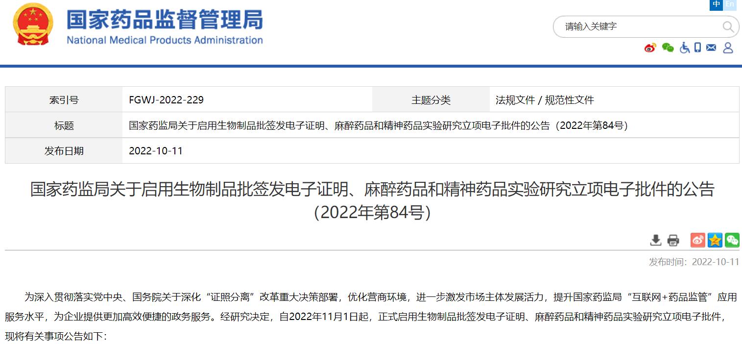 國(guó)家藥監(jiān)局關(guān)于啟用生物制品批簽發(fā)電子證明、麻醉藥品和精神藥品實(shí)驗(yàn)研究立項(xiàng)電子批件的公告(2022年第84號(hào))