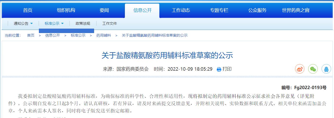 1. 本周發(fā)布鹽酸精氨酸藥用輔料標(biāo)準(zhǔn)草案的公示。