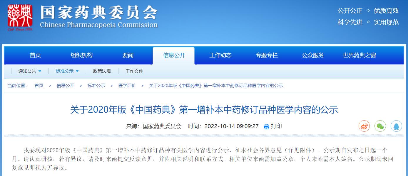 關(guān)于2020年版《中國藥典》第一增補本中藥修訂品種醫(yī)學(xué)內(nèi)容的公示