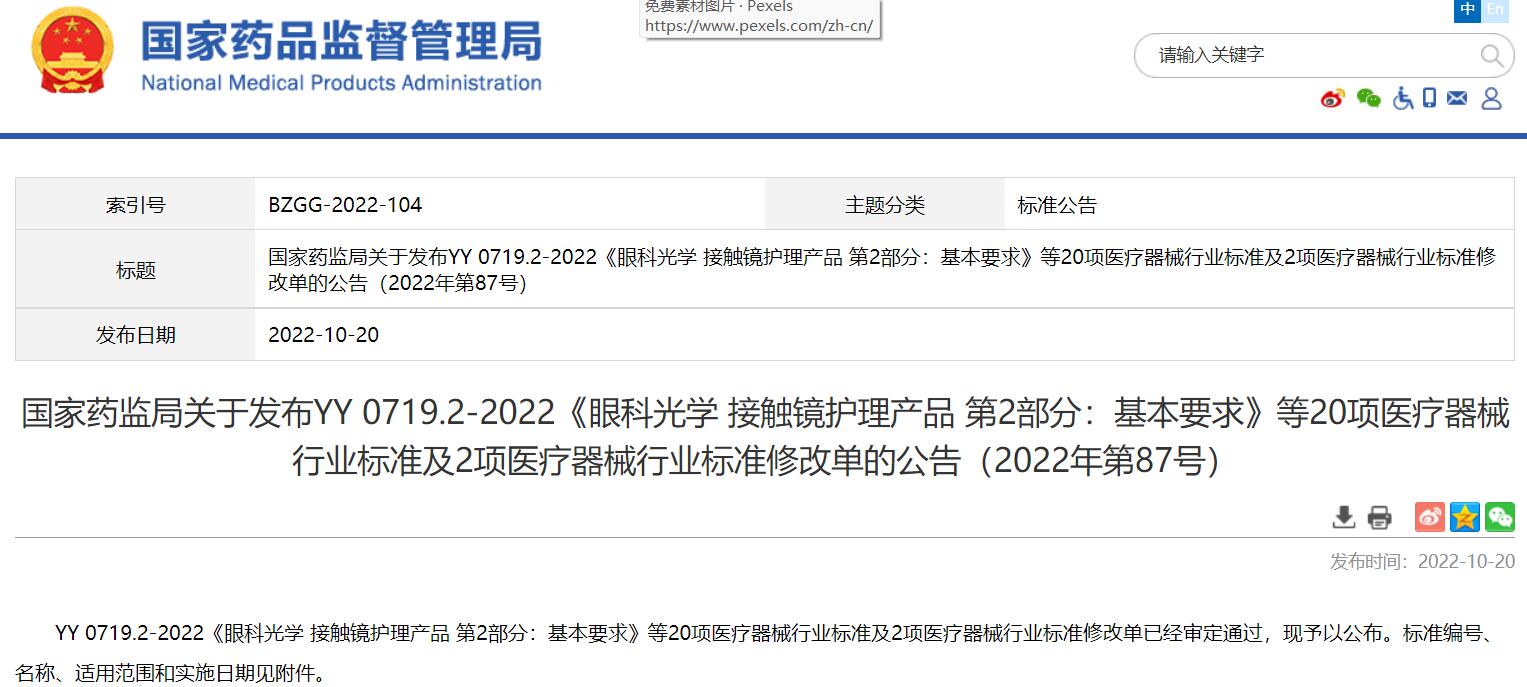 國家藥監(jiān)局關(guān)于發(fā)布YY 0719.2-2022《眼科光學(xué)接觸鏡護理產(chǎn)品第2部分:基本要求》等20項醫(yī)療器械行業(yè)標(biāo)準(zhǔn)及2項醫(yī)療器械行業(yè)標(biāo)準(zhǔn)修改單的公告(2022年第87號)