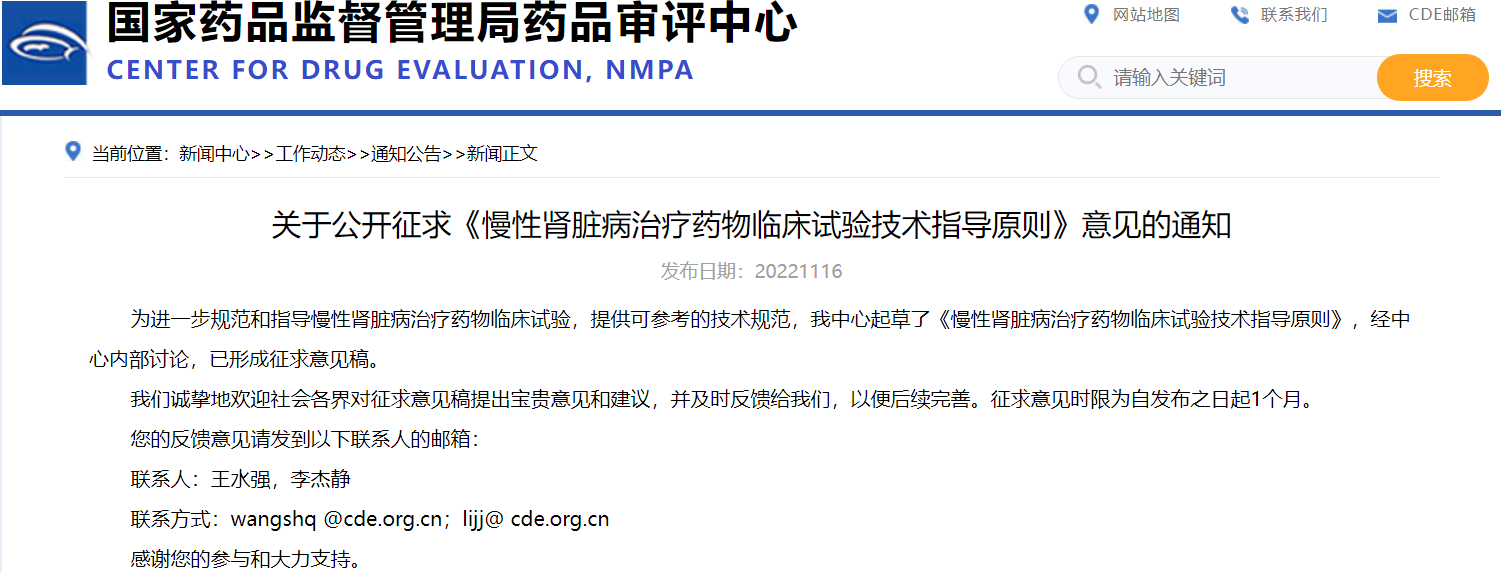 關(guān)于公開征求《慢性腎臟病治療藥物臨床試驗(yàn)技術(shù)指導(dǎo)原則》意見的通知