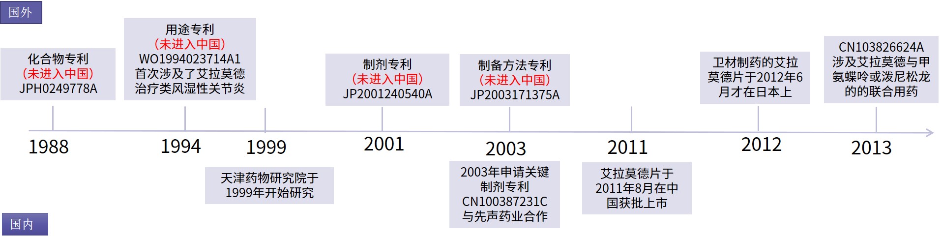 艾拉莫德(Iguratimod)臨床上用于治療類風(fēng)濕性關(guān)節(jié)炎。艾拉莫德化合物由日本富山化學(xué)于1988年申請了化合物專利JPH0249778A,后富山化學(xué)與衛(wèi)材藥業(yè)進行合作開發(fā),明確了研發(fā)艾拉莫德的主要應(yīng)用方向為類風(fēng)濕性關(guān)節(jié)炎并進行了臨床研究,于1994年申請的專利WO1994023714A1首次涉及了艾拉莫德治療類風(fēng)濕性關(guān)節(jié)炎,該專利在日本、歐洲、美國等國家或地區(qū)獲得授權(quán),但是卻沒有進入中國。但艾拉莫德關(guān)鍵的化合物專利(JPH0249778A)及用途專利(WO1994023714A1)未進入中國的專利布局失誤,為后來先聲藥業(yè)的艾拉莫德片率先上市而衛(wèi)材失去中國市場埋下了伏筆。隨著臨床的進展,富山化學(xué)在2001-2003年又申請了涉及艾拉莫德片的制劑專利JP2001240540A及艾拉莫德制備方法的制備方法專利JP2003171375A,該2件專利同樣也未進入中國。
