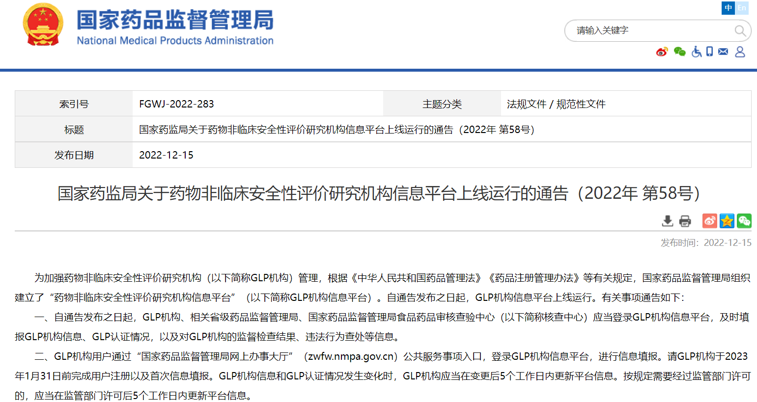 國家藥監(jiān)局關(guān)于藥物非臨床安全性評價(jià)研究機(jī)構(gòu)信息平臺(tái)上線運(yùn)行的通告(2022年 第58號)