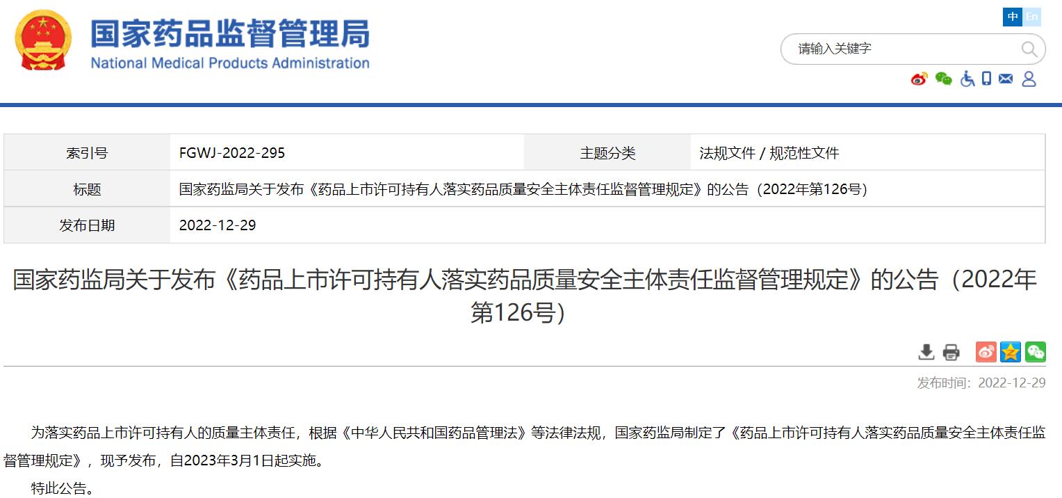國家藥監(jiān)局關(guān)于發(fā)布《藥品上市許可持有人落實藥品質(zhì)量安全主體責任監(jiān)督管理規(guī)定》的公告(2022年第126號)