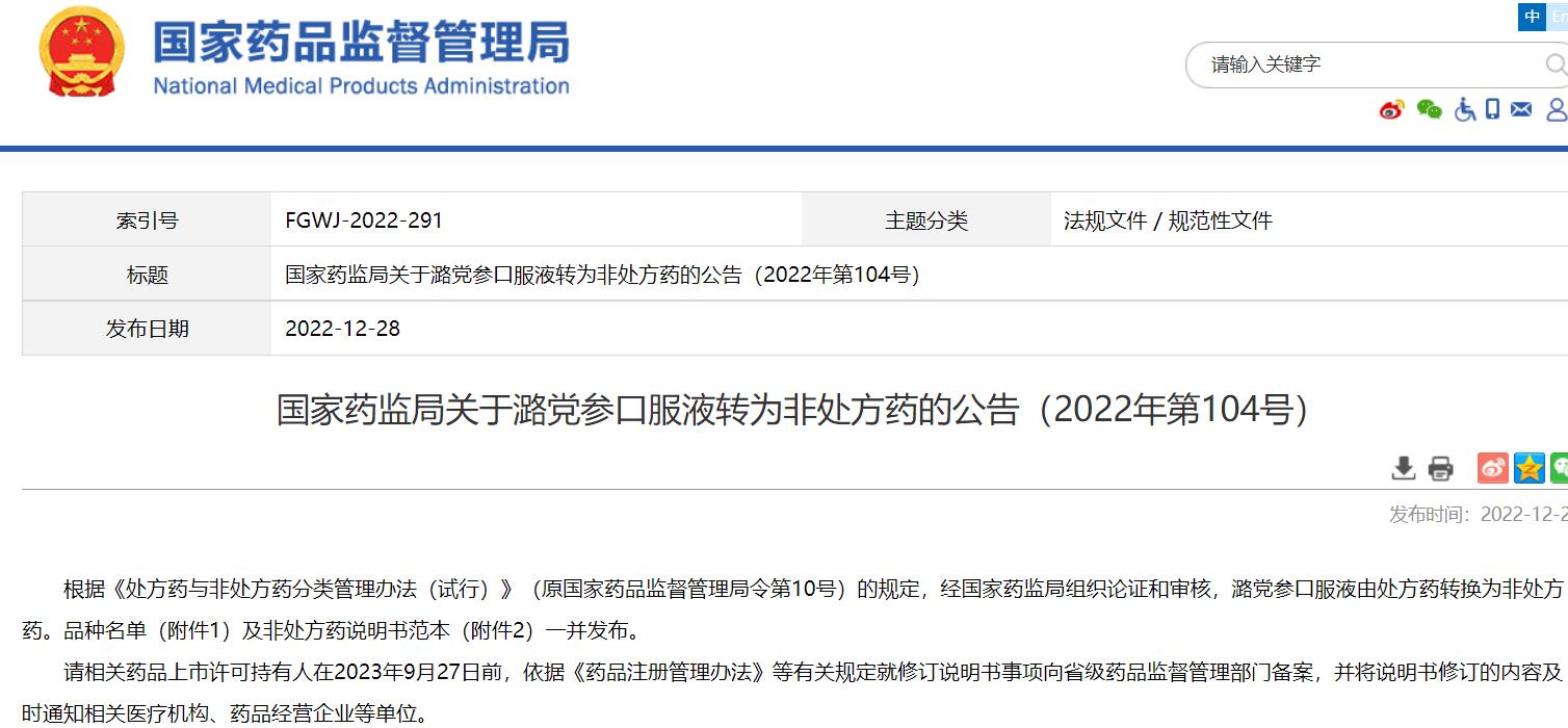 國家藥監(jiān)局關(guān)于潞黨參口服液轉(zhuǎn)為非處方藥的公告(2022年第104號)