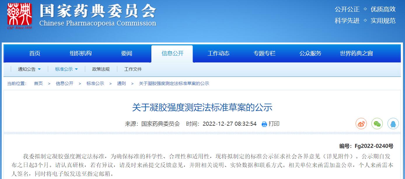 國家藥典委發(fā)布凝膠強度測定法標準草案的公示。