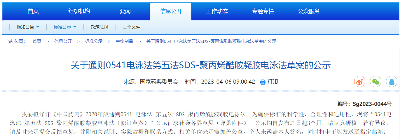 關(guān)于通則0541電泳法第五法SDS-聚丙烯酷胺凝膠電泳法草案的公示