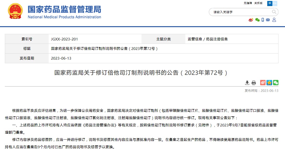 國家藥監(jiān)局關(guān)于修訂倍他司汀制劑說明書的公告(2023年第72號)