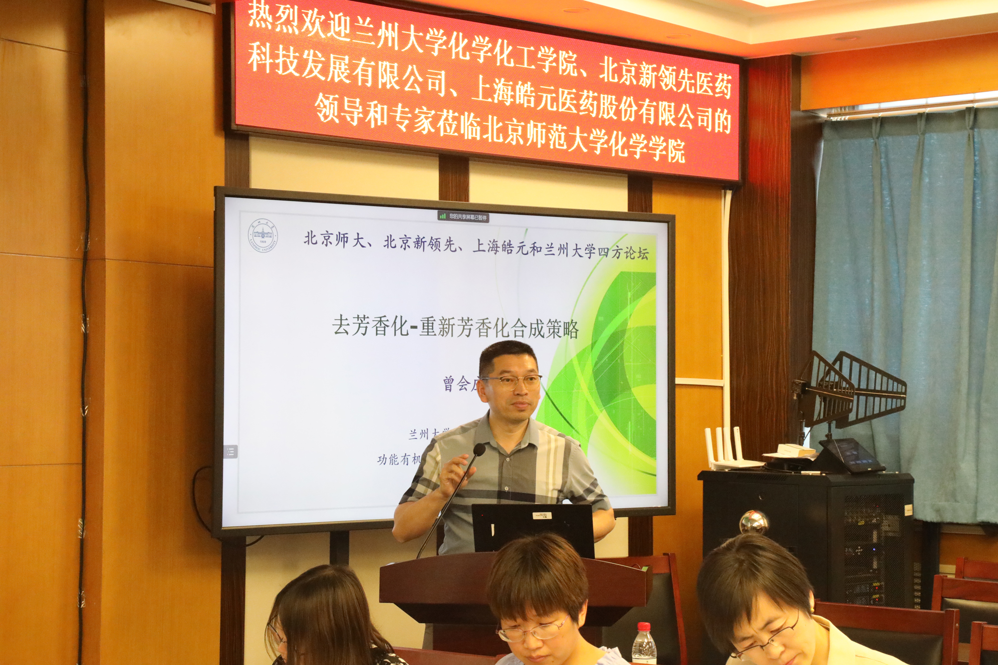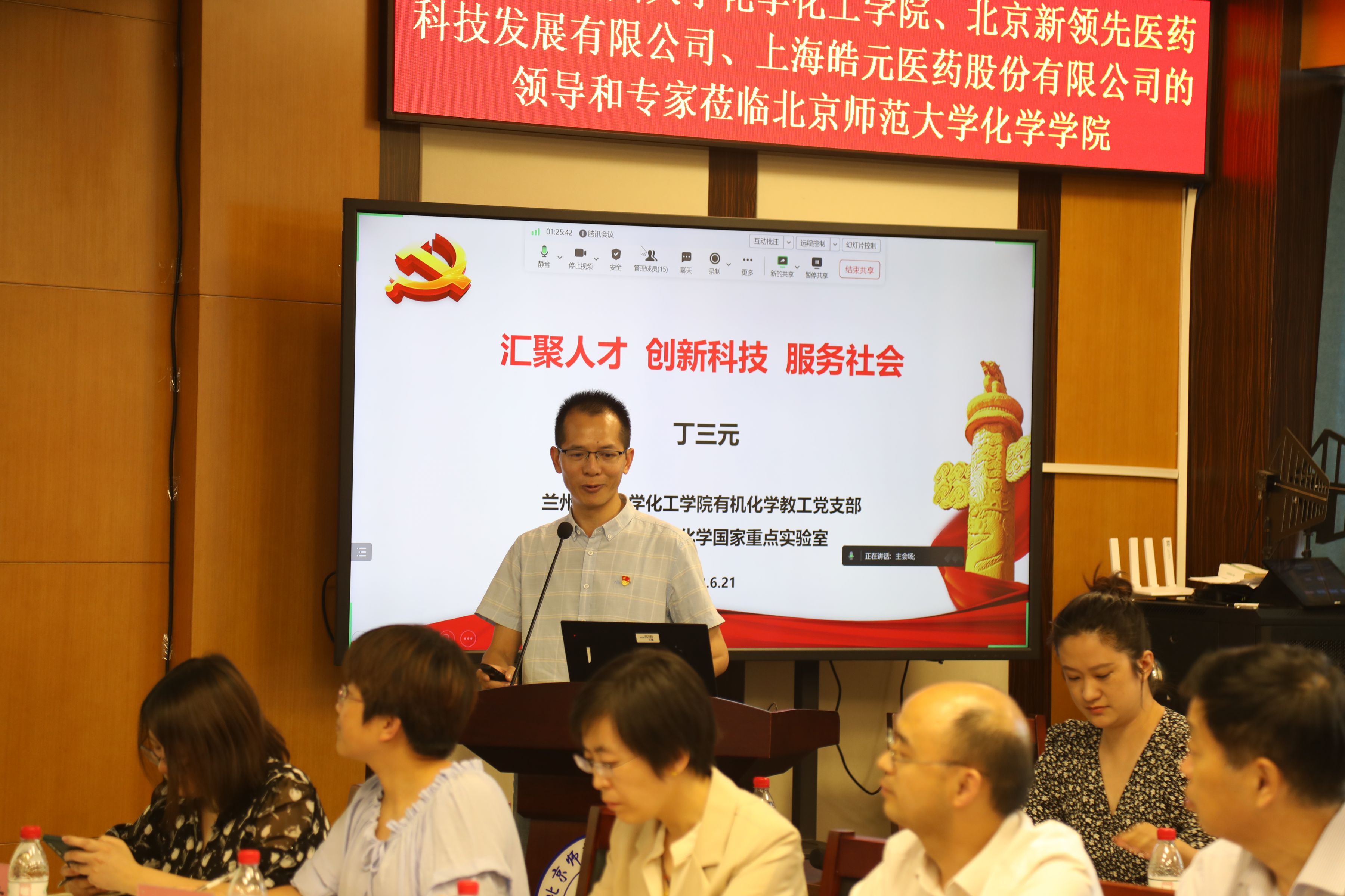 參加本次研討活動的有:北京師范大學化學學院黨委書記盧忠林教授,化學學院院長毛蘭群教授,化學學院黨委副書記韓娟博士,科研院校地合作與科研成果轉(zhuǎn)化處副處長孫根班教授;蘭州大學化學化工學院黨委書記杜生一博士,功能有機分子化學國家重點實驗室主任王為教授(線上);新領(lǐng)先醫(yī)藥黨總支書記、董事長陶新華先生,副總裁顏耀東先生、張翔先生,黨總支副書記、固體制劑事業(yè)部總經(jīng)理鞠平女士,黨總支紀支檢委員、臨床運營部副總監(jiān)杜書青女士;上海皓元產(chǎn)品負責人、樂研首席科學家陳委先生等30余人。