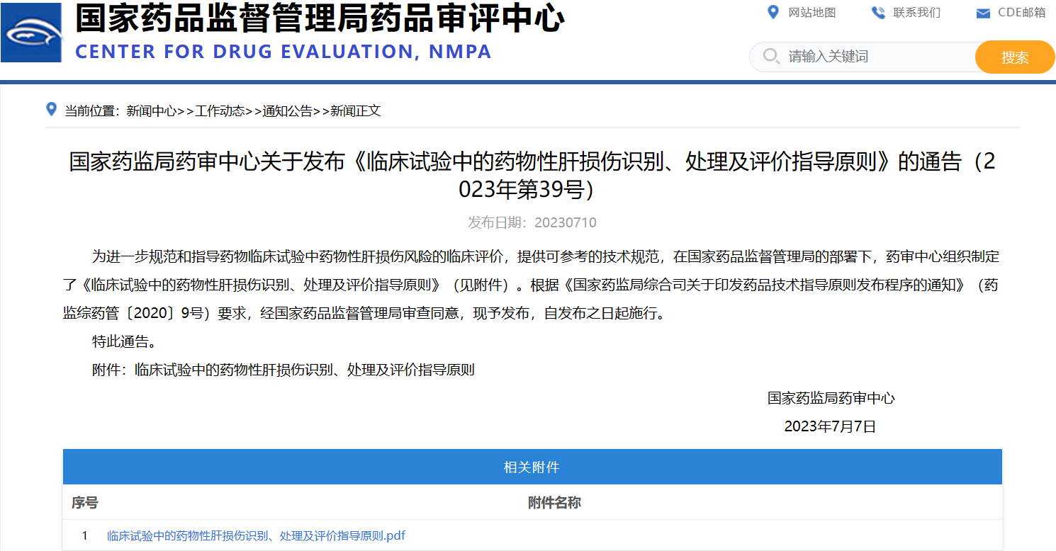 國家藥監(jiān)局藥審中心關于發(fā)布《臨床試驗中的藥物性肝損傷識別、處理及評價指導原則》的通告(2023年第39號)