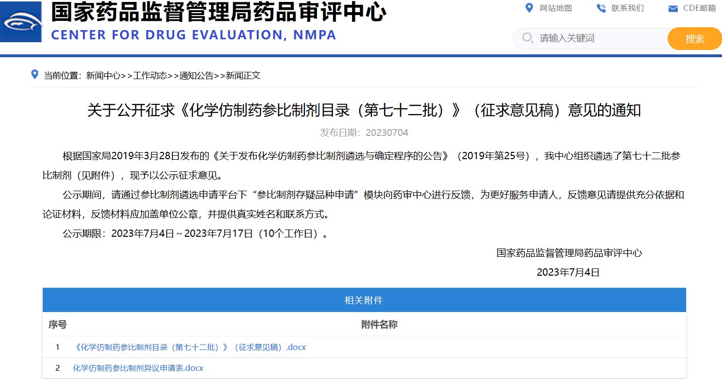 關于公開征求《化學仿制藥參比制劑目錄(第七十二批)》(征求意見稿)意見的通知
