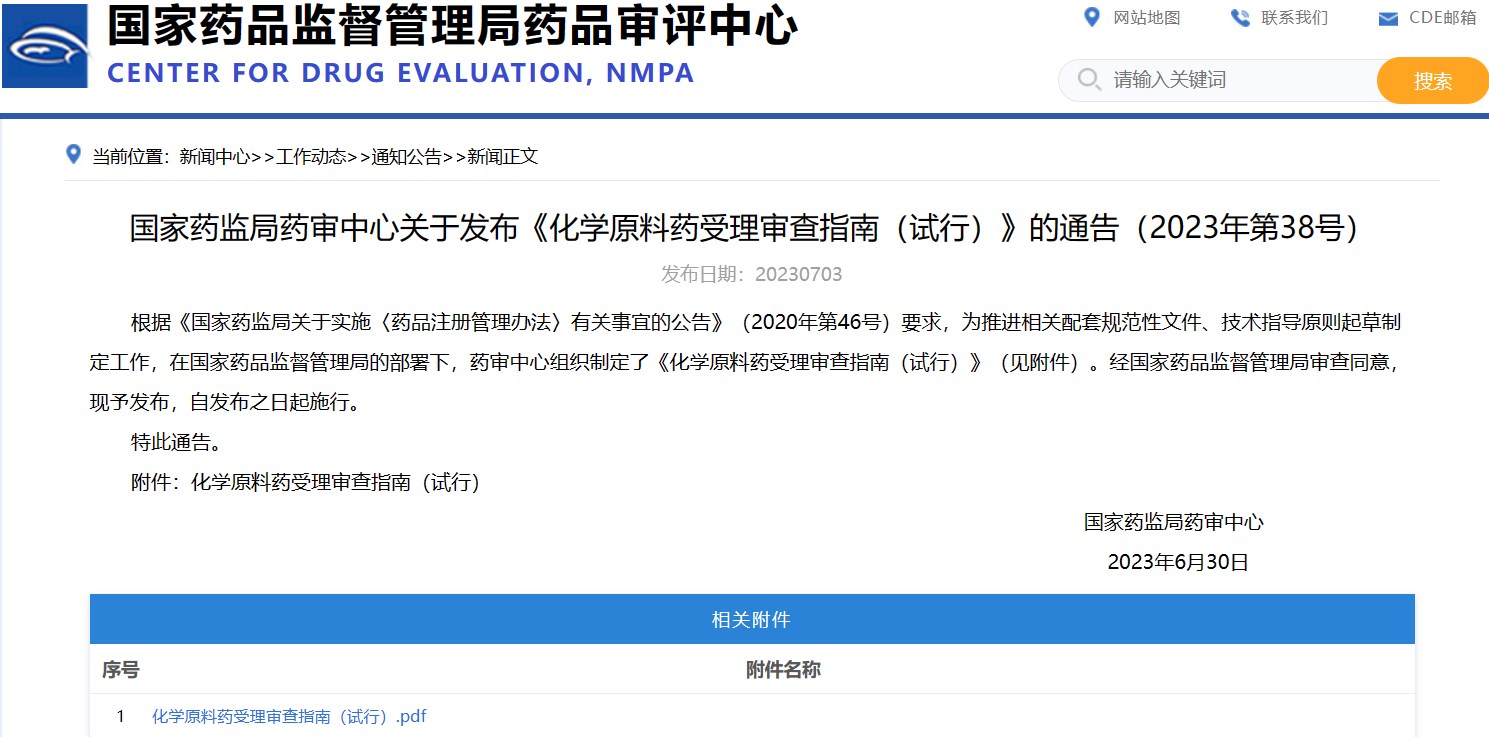 國家藥監(jiān)局藥審中心關于發(fā)布《化學原料藥受理審查指南(試行)》的通告(2023年第38號)