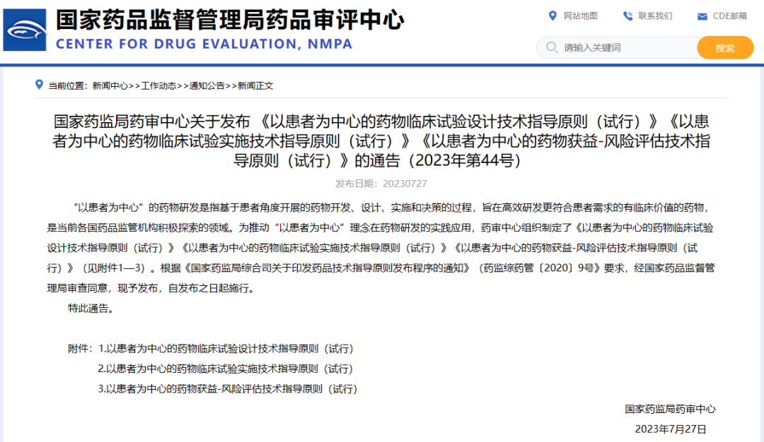 國(guó)家藥監(jiān)局藥審中心關(guān)于發(fā)布 《以患者為中心的藥物臨床試驗(yàn)設(shè)計(jì)技術(shù)指導(dǎo)原則(試行)》《以患者為中心的藥物臨床試驗(yàn)實(shí)施技術(shù)指導(dǎo)原則(試行)》《以患者為中心的藥物獲益-風(fēng)險(xiǎn)評(píng)估技術(shù)指導(dǎo)原則(試行)》的通告(2023年第44號(hào))