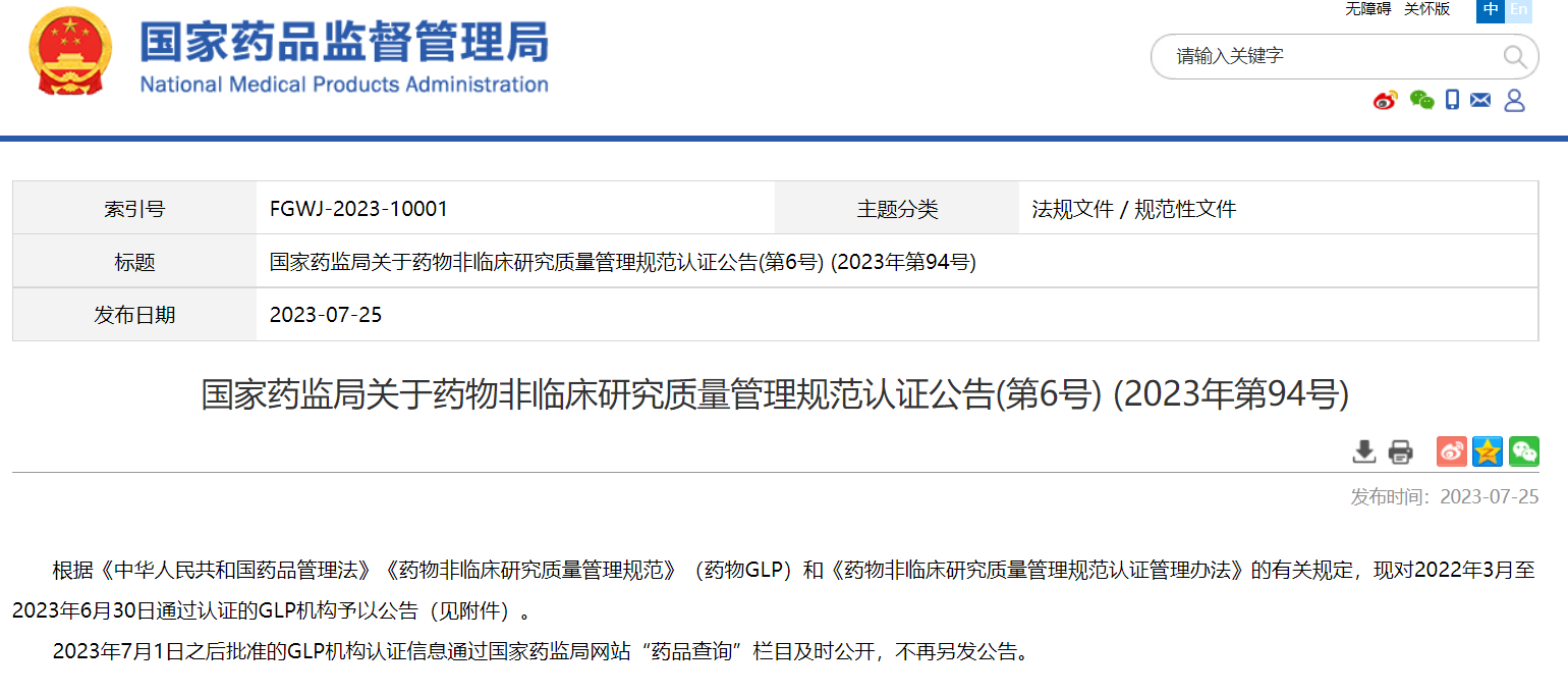 國(guó)家藥監(jiān)局關(guān)于藥物非臨床研究質(zhì)量管理規(guī)范認(rèn)證公告(第6號(hào)) (2023年第94號(hào))
