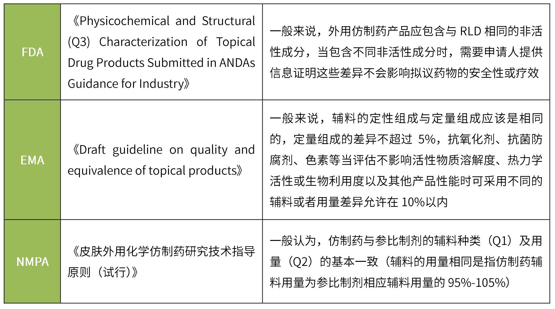 透皮制劑仿制藥一般要求與參比制劑的輔料種類及用量一致,無(wú)論FDA、EMA還是NMPA,在對(duì)處方組成的要求上大同小異,均要求輔料種類一致、用量基本相同。