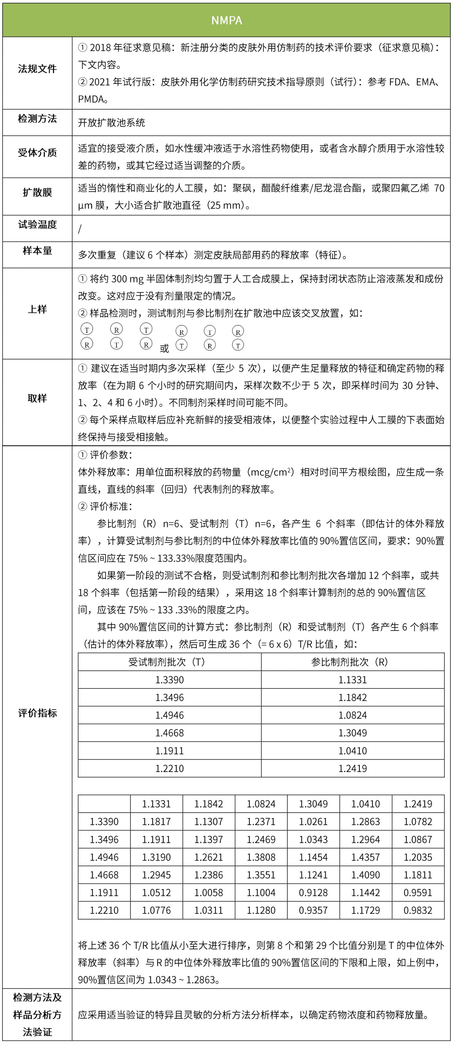 下表匯總了各國(guó)法規(guī)對(duì)IVRT的評(píng)價(jià)要求??傮w而言,各國(guó)對(duì)試驗(yàn)過(guò)程的要求很多都是相同的,評(píng)價(jià)標(biāo)準(zhǔn)則不同,中國(guó)的評(píng)價(jià)標(biāo)準(zhǔn)在18年征求意見(jiàn)稿時(shí)與FDA一致,試行版則只提及參考FDA、EMA、PMDA,歐盟和日本的評(píng)價(jià)標(biāo)準(zhǔn)與FDA也不一致。