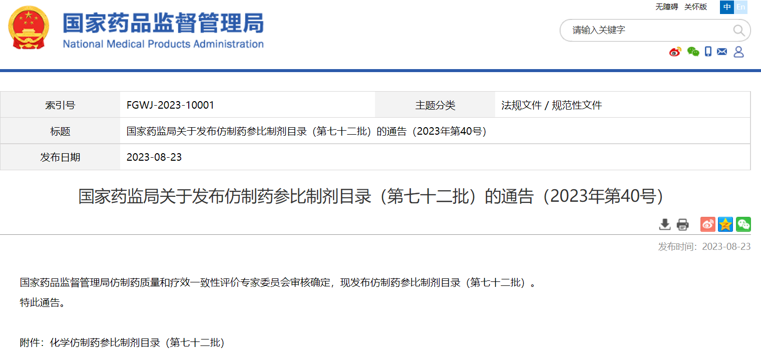 國家藥監(jiān)局關(guān)于發(fā)布仿制藥參比制劑目錄(第七十二批)的通告(2023年第40號)