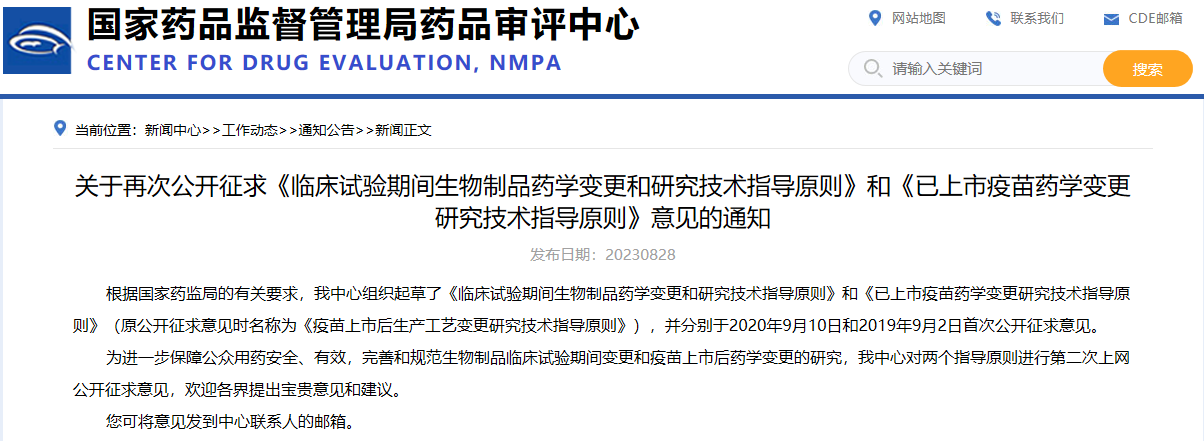 關(guān)于再次公開征求《臨床試驗期間生物制品藥學(xué)變更和研究技術(shù)指導(dǎo)原則》和《已上市疫苗藥學(xué)變更研究技術(shù)指導(dǎo)原則》意見的通知