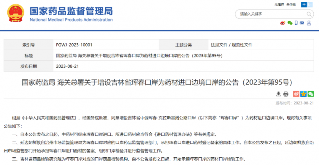 國家藥監(jiān)局海關(guān)總署關(guān)于增設(shè)吉林省琿春口岸為藥材進口邊境口岸的公告(2023年第95號)