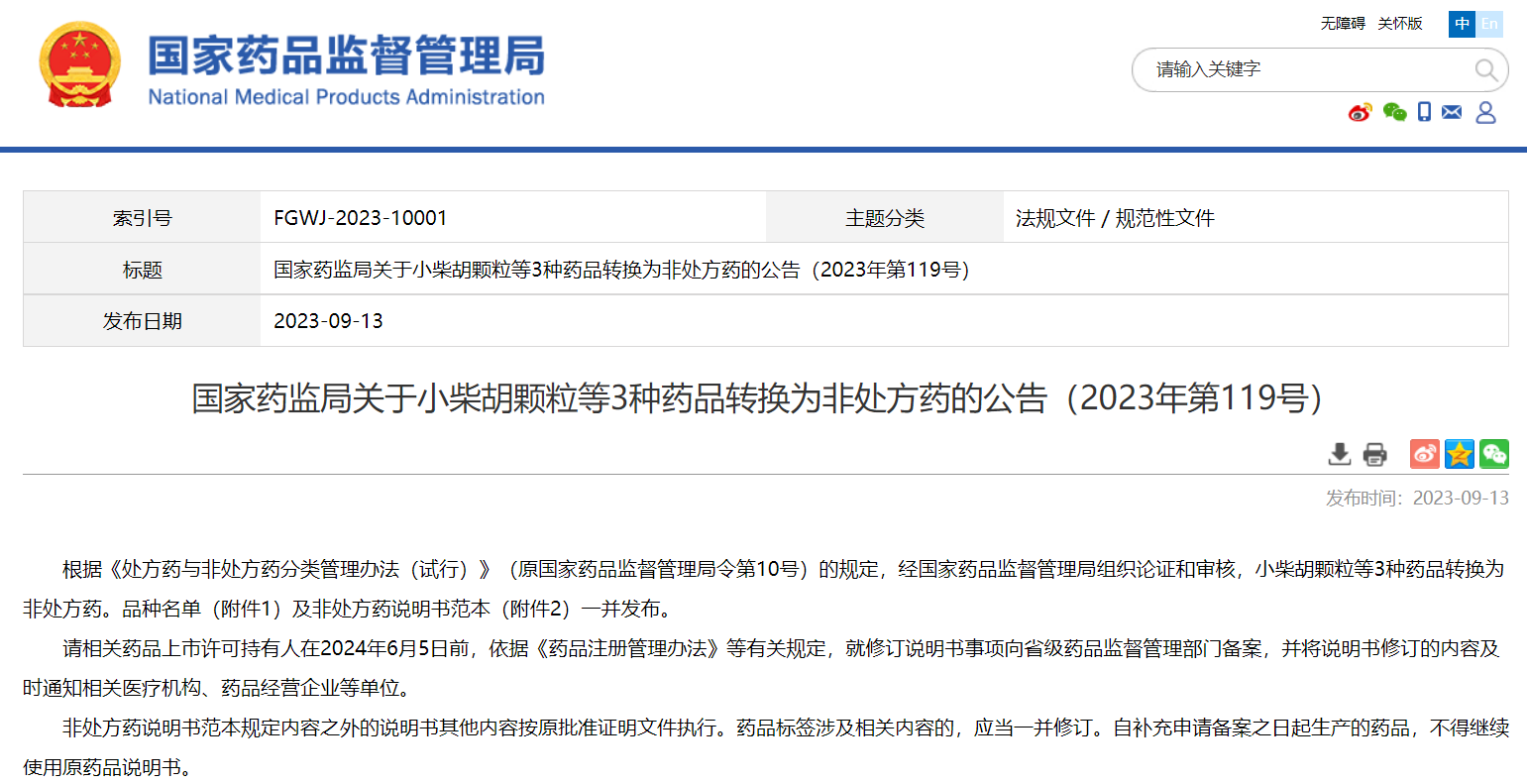 國家藥監(jiān)局關(guān)于小柴胡顆粒等3種藥品轉(zhuǎn)換為非處方藥的公告(2023年第119號)
