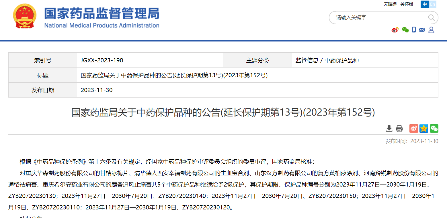 國家藥監(jiān)局關(guān)于中藥保護(hù)品種的公告(延長(zhǎng)保護(hù)期第13號(hào))(2023年第152號(hào))