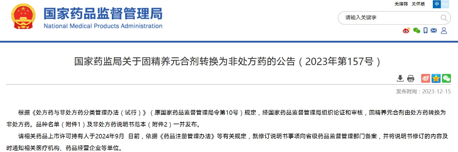國家藥監(jiān)局關(guān)于固精養(yǎng)元合劑轉(zhuǎn)換為非處方藥的公告(2023年第157號)