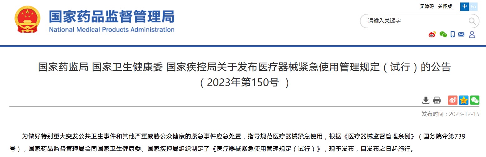 國家藥監(jiān)局 國家衛(wèi)生健康委 國家疾控局關(guān)于發(fā)布醫(yī)療器械緊急使用管理規(guī)定(試行)的公告(2023年第150號 )