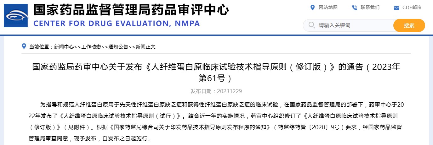 國(guó)家藥監(jiān)局藥審中心關(guān)于發(fā)布《人纖維蛋白原臨床試驗(yàn)技術(shù)指導(dǎo)原則(修訂版)》的通告(2023年第61號(hào))
