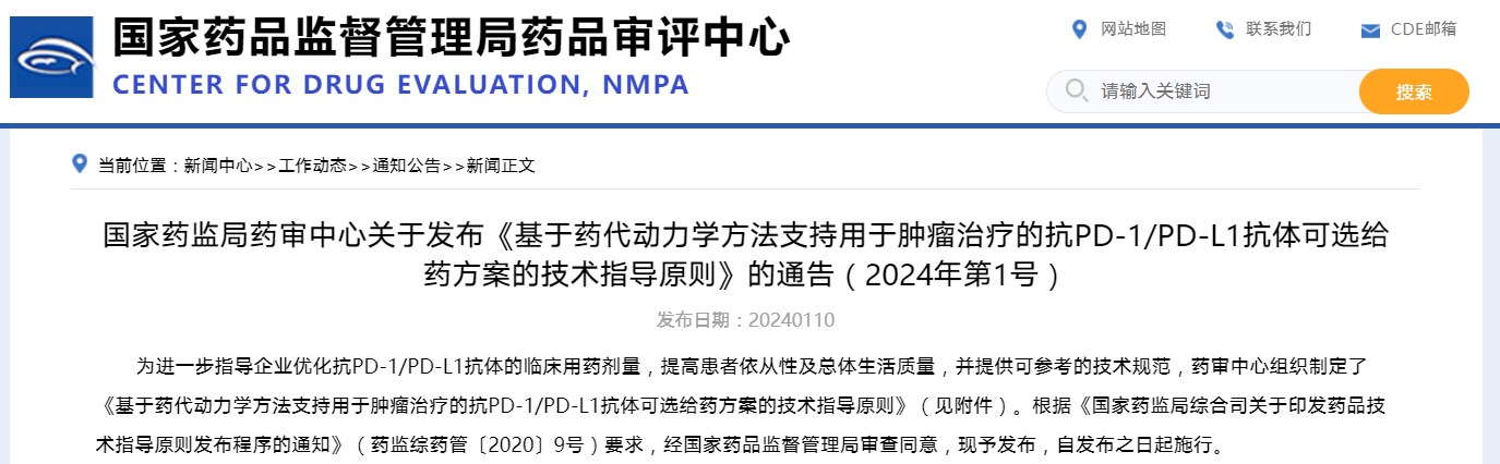 國(guó)家藥監(jiān)局藥審中心關(guān)于發(fā)布《基于藥代動(dòng)力學(xué)方法支持用于腫瘤治療的抗PD-1/PD-L1抗體可選給藥方案的技術(shù)指導(dǎo)原則》的通告(2024年第1號(hào))