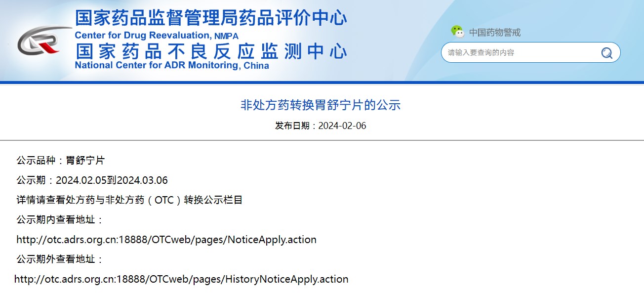 非處方藥轉(zhuǎn)換胃舒寧片的公示