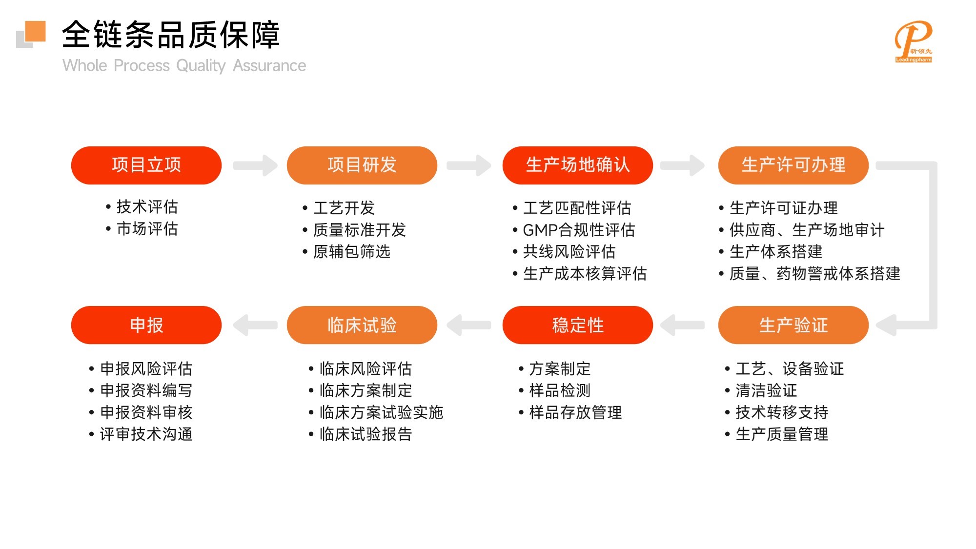 新領(lǐng)先一直秉承“篤行藥學(xué)臨床全程全員質(zhì)量管控,共創(chuàng)醫(yī)藥研發(fā)全產(chǎn)業(yè)鏈品質(zhì)龍頭”的質(zhì)量方針,嚴(yán)格執(zhí)行ISO9001質(zhì)量管理體系要求,對項目進(jìn)行全鏈條的質(zhì)量控制。立項階段,由專業(yè)團(tuán)隊對原輔料、包材等關(guān)鍵物料的可及性和質(zhì)量進(jìn)行評估,從源頭控制項目風(fēng)險;研發(fā)過程中,通過QA、上會管理中心、技術(shù)委員會等多部門聯(lián)動,對項目的技術(shù)、合規(guī)性、進(jìn)度等方面進(jìn)行嚴(yán)格把控,致力于實現(xiàn)項目“0缺陷”交付。