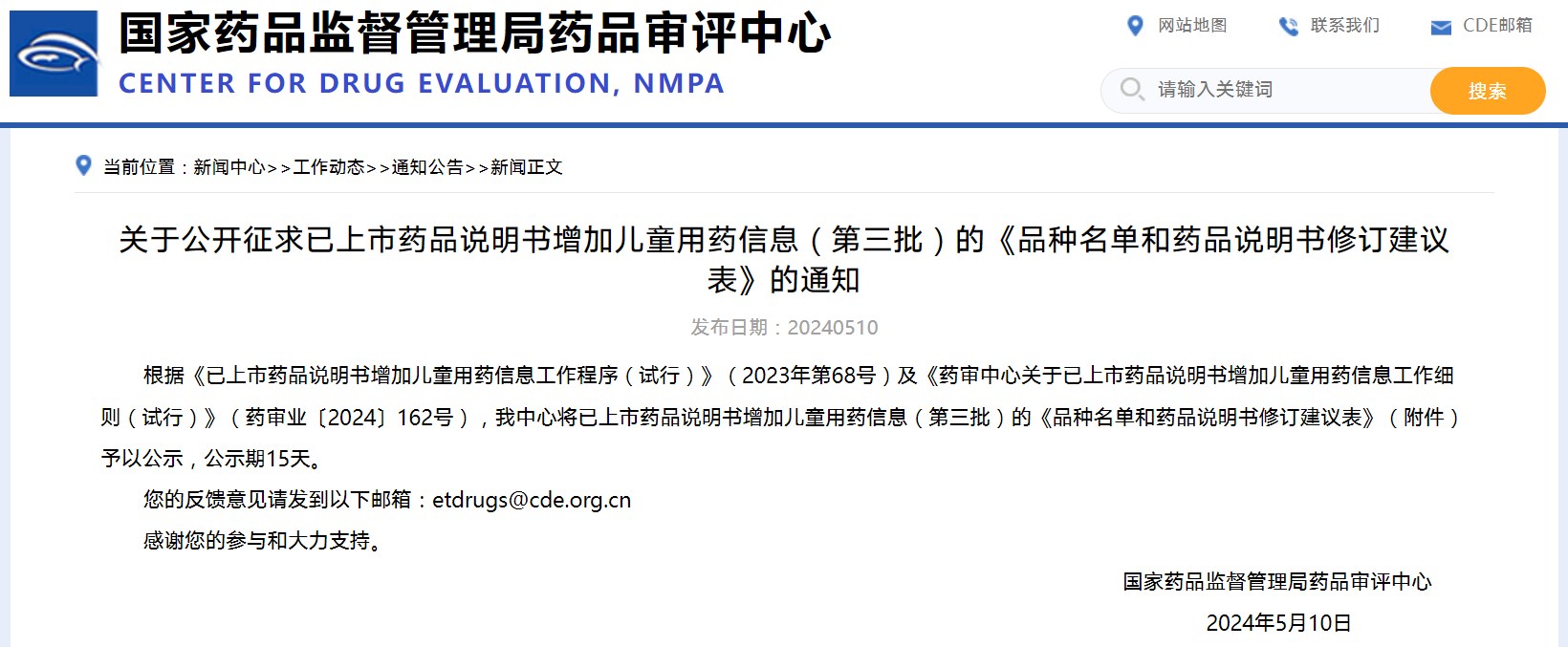關(guān)于公開征求已上市藥品說明書增加兒童用藥信息(第三批)的《品種名單和藥品說明書修訂建議表》的通知