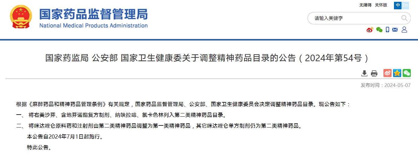國家藥監(jiān)局 公安部 國家衛(wèi)生健康委關(guān)于調(diào)整精神藥品目錄的公告(2024年第54號(hào))