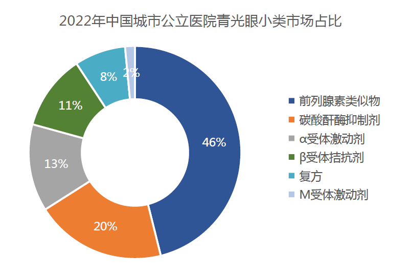 抗青光眼藥物可分為5類,作為一線治療藥物的前列腺素類似物在2022年以46%的比例主導(dǎo)市場,碳酸酐酶抑制劑、β腎上腺素拮抗劑、α腎上腺素能受體激動(dòng)劑、復(fù)方制劑分別占20%、13%、11%和8%的市場份額。