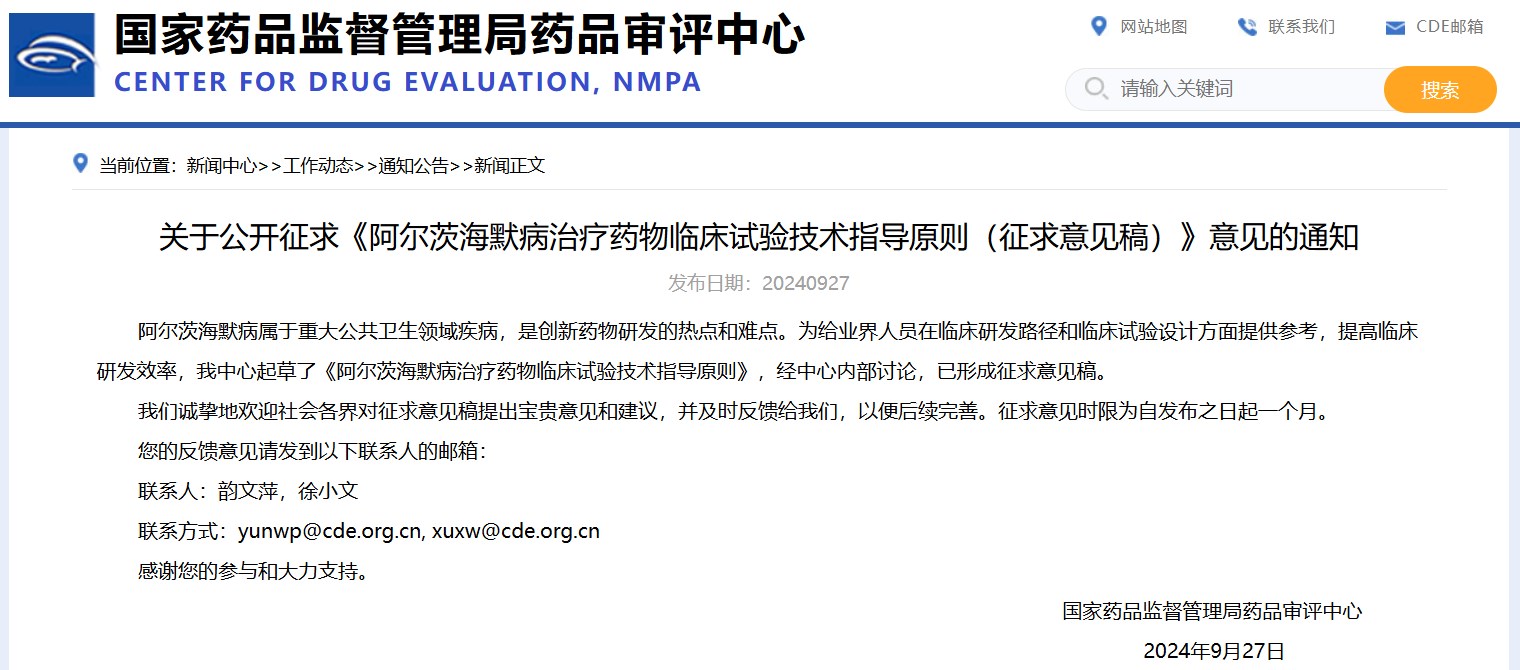 關(guān)于公開征求《阿爾茨海默病治療藥物臨床試驗技術(shù)指導(dǎo)原則(征求意見稿)》意見的通知