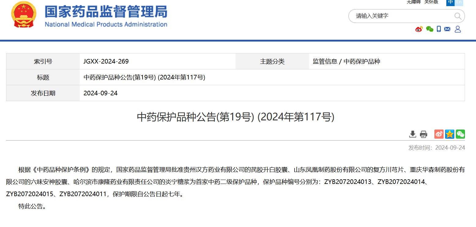 中藥保護(hù)品種公告(第19號) (2024年第117號)