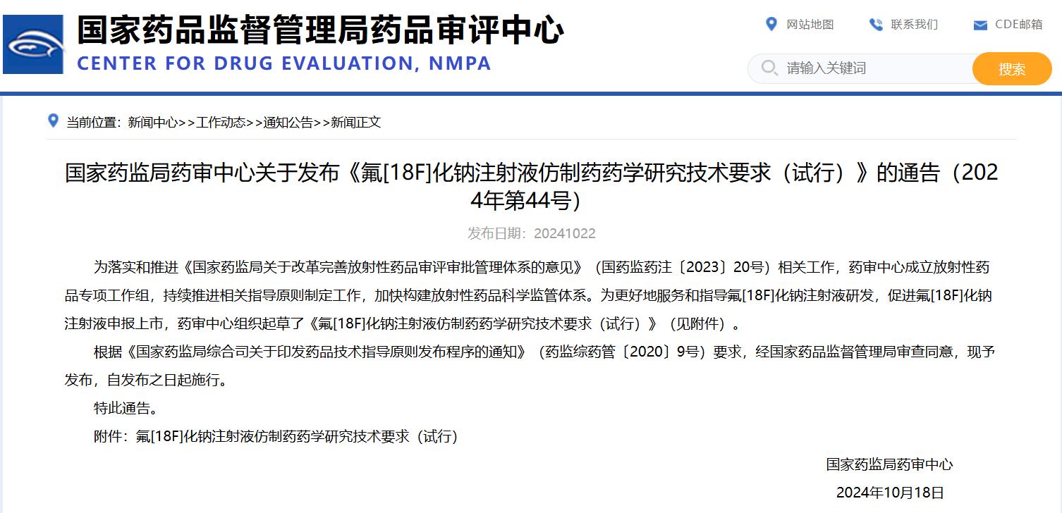國(guó)家藥監(jiān)局藥審中心關(guān)于發(fā)布《氟[18F]化鈉注射液仿制藥藥學(xué)研究技術(shù)要求(試行)》的通告(2024年第44號(hào))