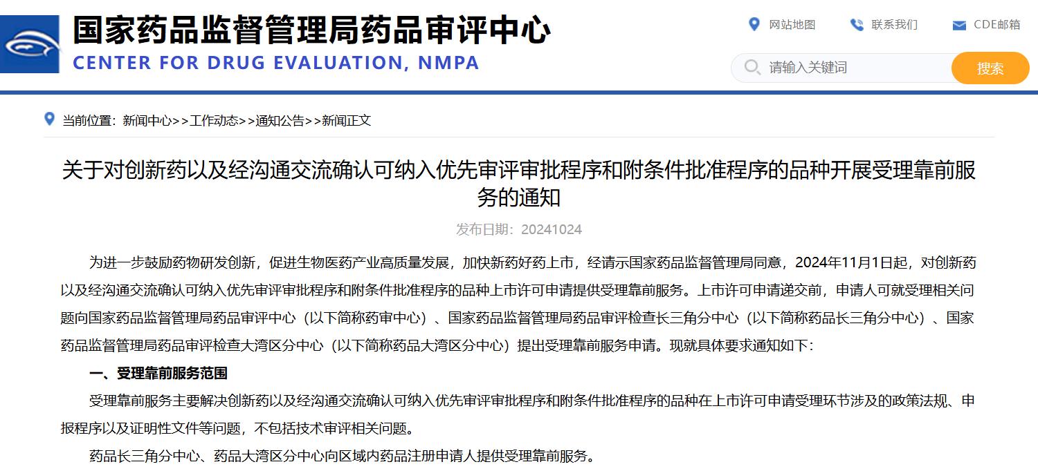 關(guān)于對(duì)創(chuàng)新藥以及經(jīng)溝通交流確認(rèn)可納入優(yōu)先審評(píng)審批程序和附條件批準(zhǔn)程序的品種開(kāi)展受理靠前服務(wù)的通知