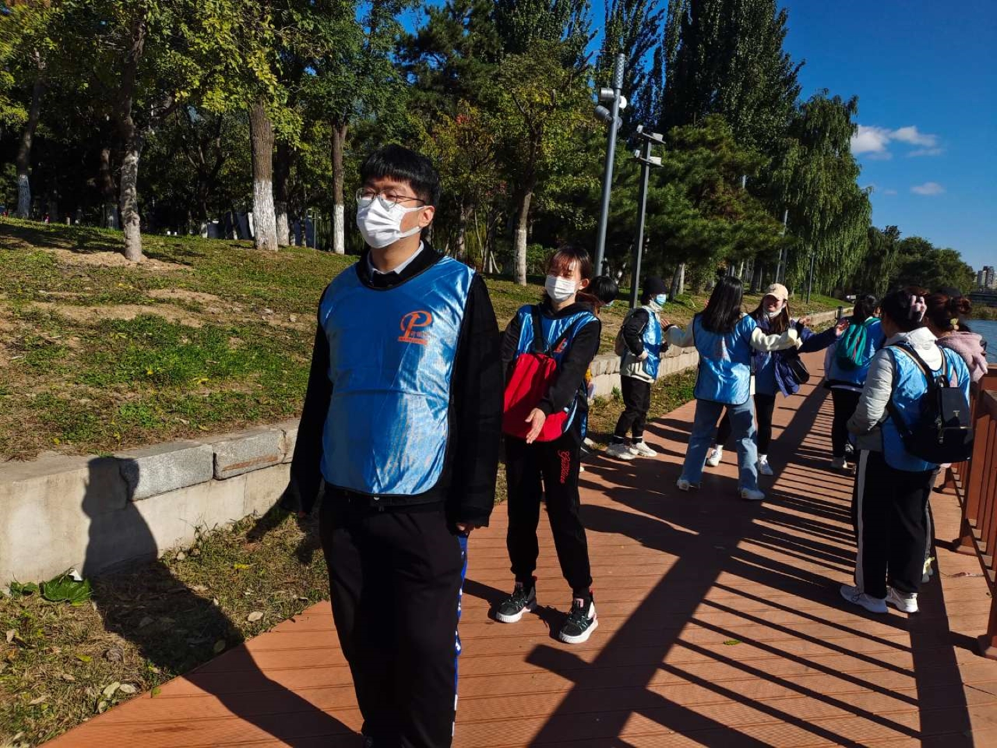 ▲ All team members hold high the team flag, listen to the autumn wind, step on fallen leaves, talk and laugh, and accompany their peers.