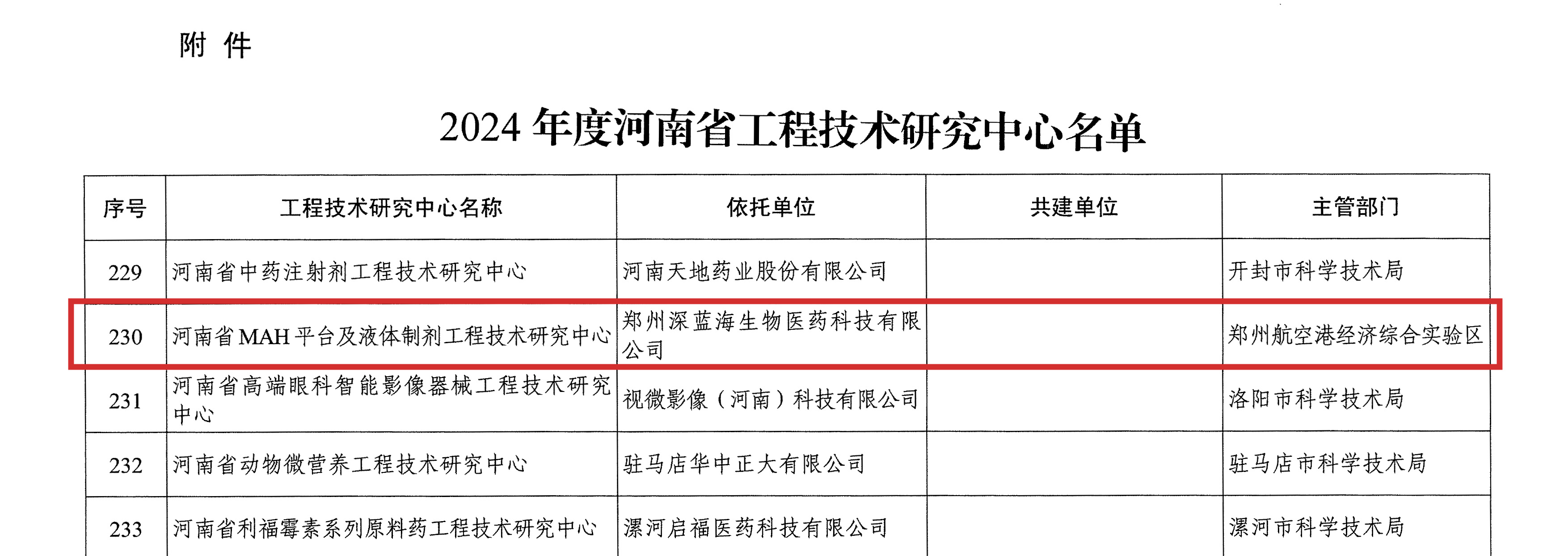 Recently, the Henan Provincial Department of Science and Technology announced the list of Henan Provincial Engineering Technology Research Centers for 2024. The "Henan Provincial MAH Platform and Liquid Preparation Engineering Technology Research Center" applied by Leadingpharm CXO · Deep Blue Ocean Bio-Pharmaceutical was successfully approved. This is another provincial-level or above honor obtained by the company following titles such as "High-Tech Enterprise" and "Henan Provincial Specialized, Refined, Characteristic and Novel Small and Medium-Sized Enterprise".
